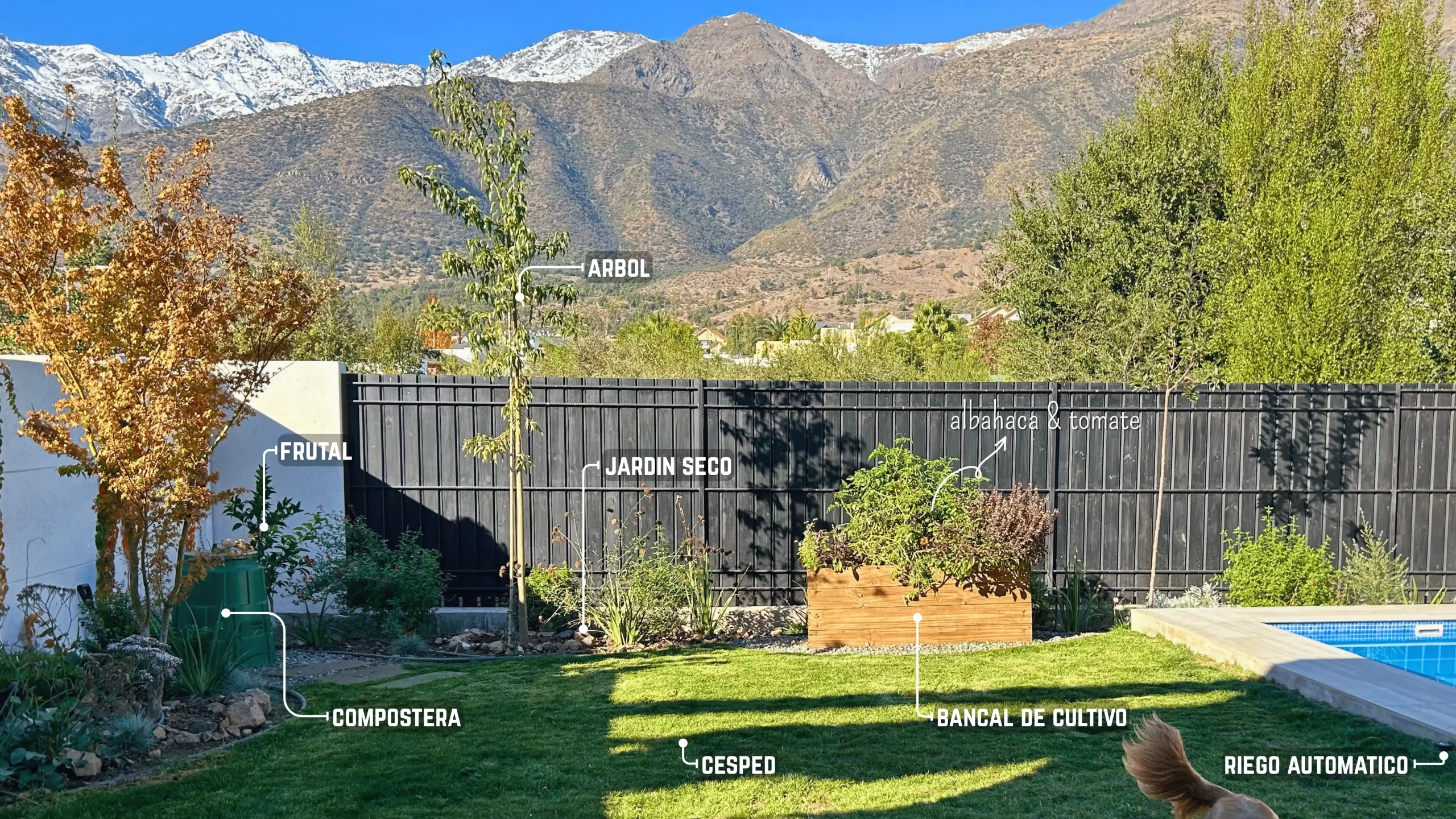 Este es un ejemplo real de cómo unimos diseño de jardín, sistema de riego automático, huerto urbano y compostaje en un solo espacio funcional y sobre todo, ecológico.